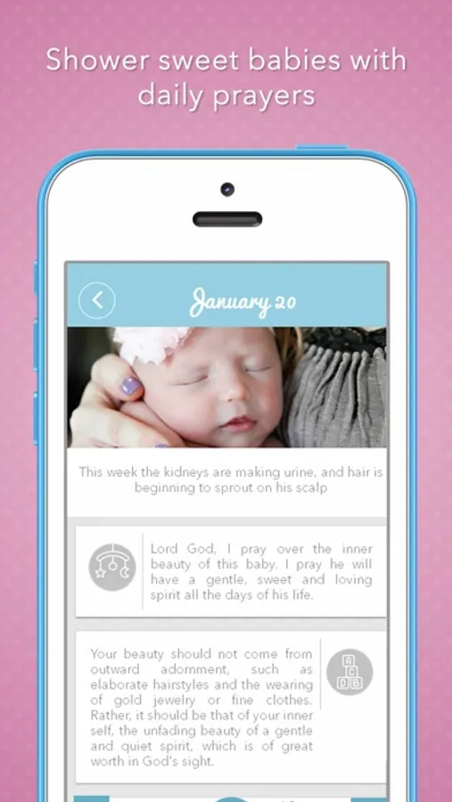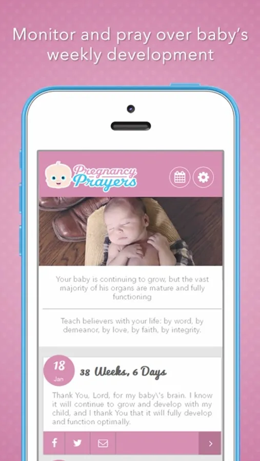 This app gives you weekly fetal development, a scripture that correlates with development and daily prayers to pray over your bundle of joy.