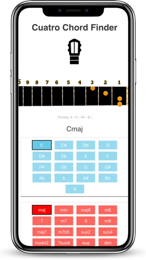 TuCuatro's Cuatro Chord Library allows you to find the chord you want to learn. Just select the base key or main chord and then select a variation (major, minor, sixth, seventh and other combinations). The chord will automatically appear on the screen after you select it.