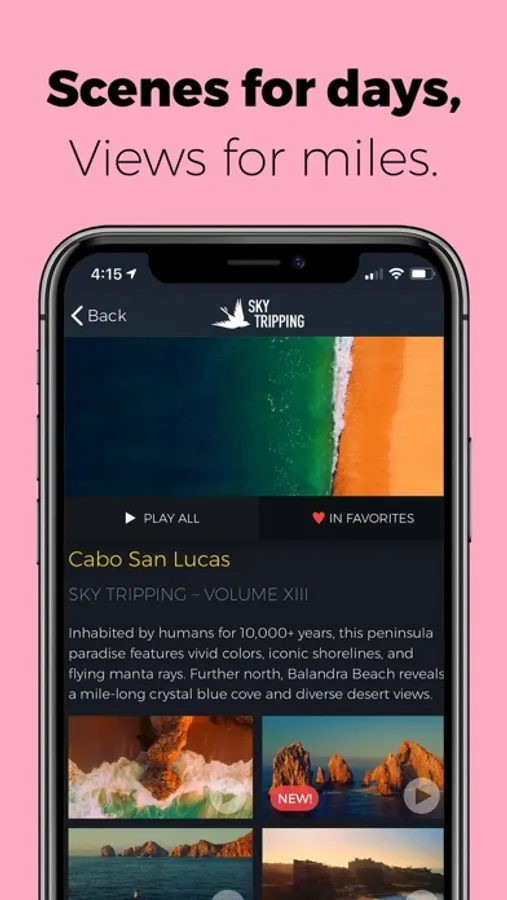 Sky Tripping brings Earth's beauty into your living room AND into your hands. Restore your energy as you explore the world from above. Your purchase includes all 12 premium films in our Sky Tripping Sampler Pack. Celebrate the majestic coastal views of The Golden State, the vibrant red rock of Devil's Kitchen Utah, the grand views in Sedona Arizona, and more. Enjoy these videos for as long as you desire. Unlock our entire library by subscribing! Treat yourself to our full library for a full 14 days for FREE once you begin your subscription. Your purchase also includes the Apple TV App. Be sure to download it from the Apple TV App Store!