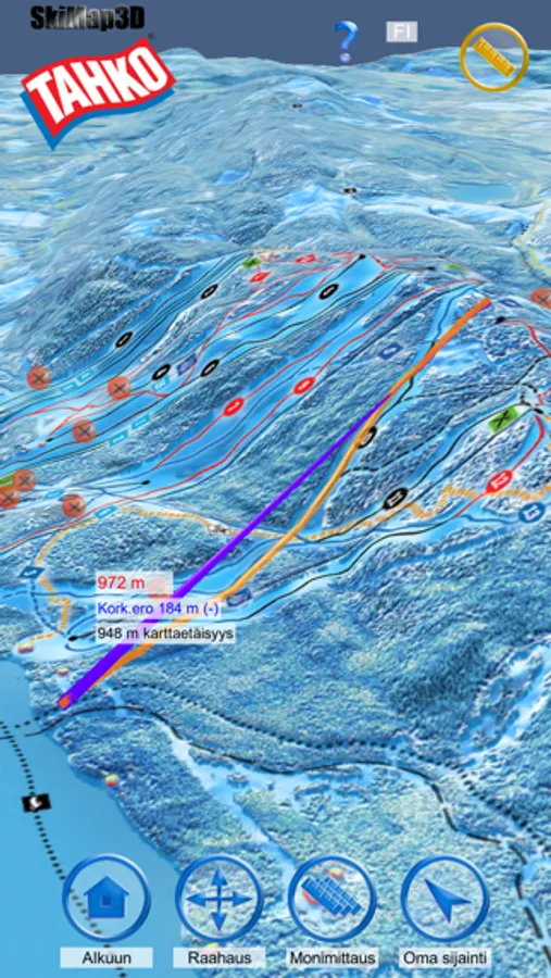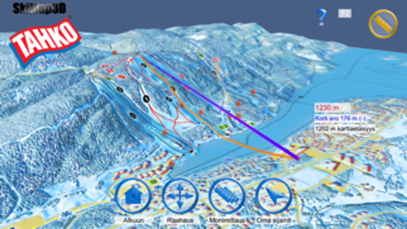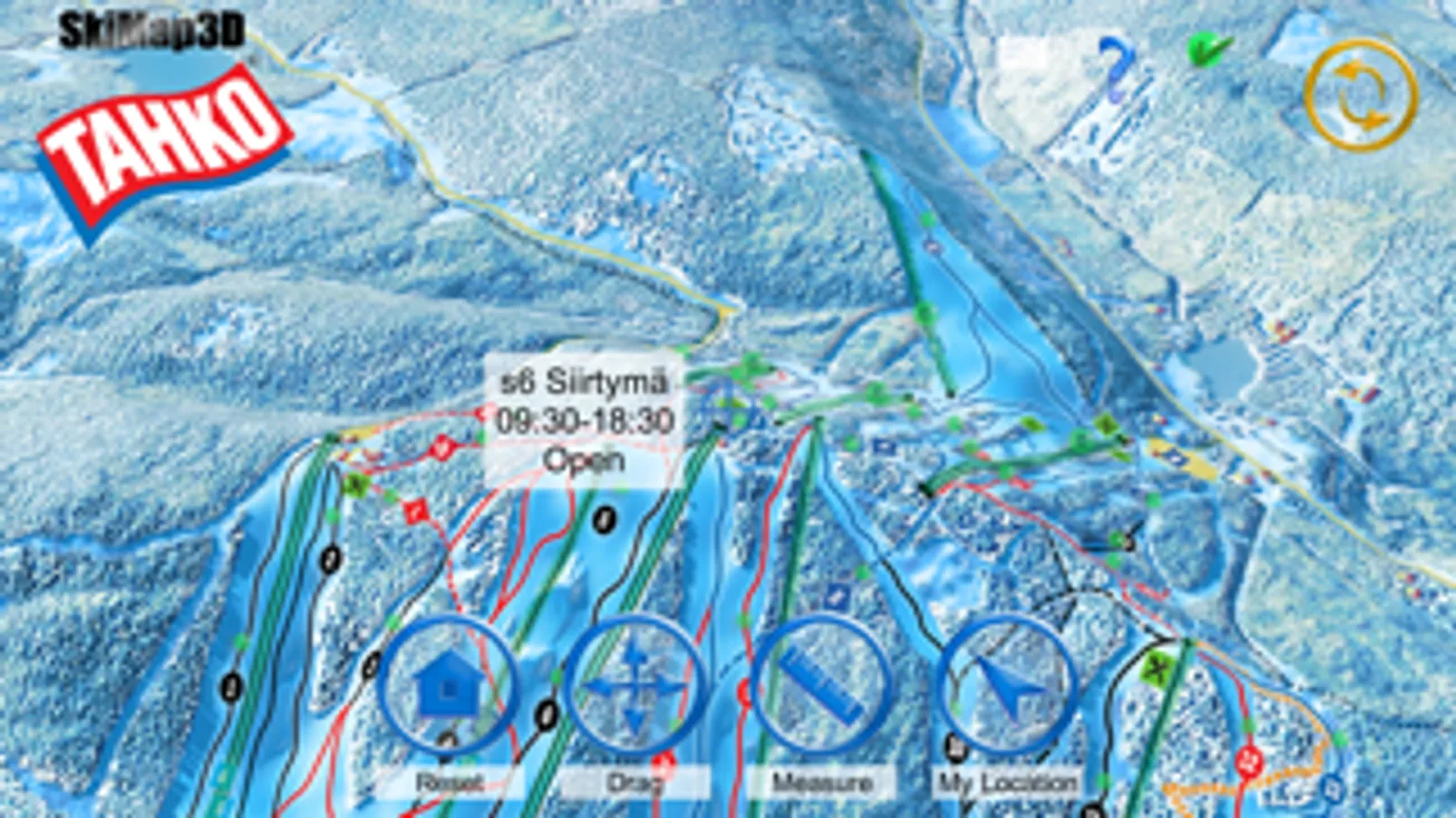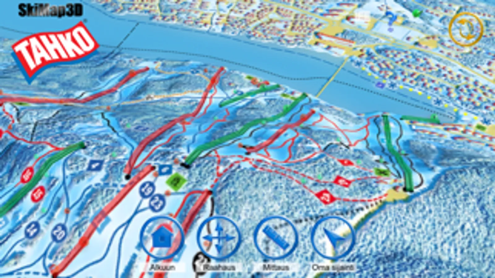 In Tahko 3D-skimap you can see with one glance the status of all lifts. You can view Tahko from different directions and measure distances. You can also check your location in the 3D-skimap and make use of the compass in your mobile device.
