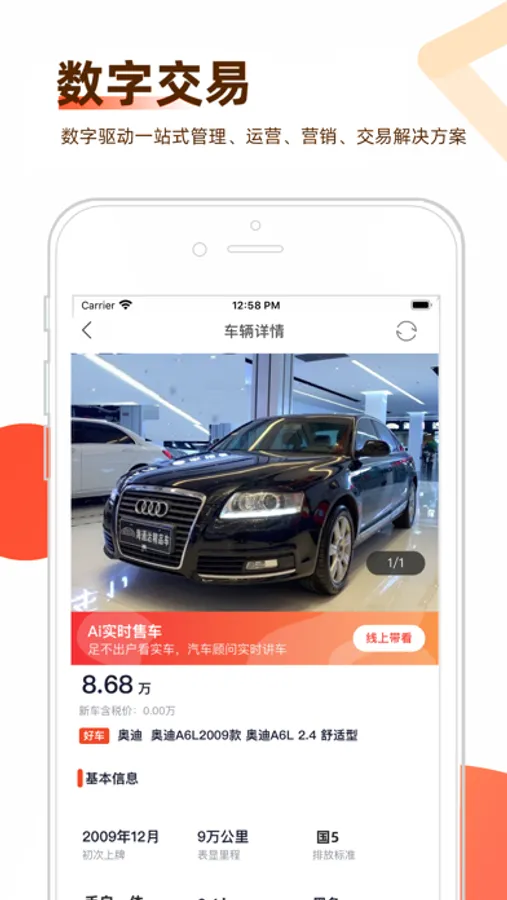 丰车数字业务系统从二手车置换、评估、采购,到库存管理,集团审批,B2C零售与B2B拍卖,财务利润,报表决策分析,售后服务等功能,全方位助力客户全方位提升盈利能力。