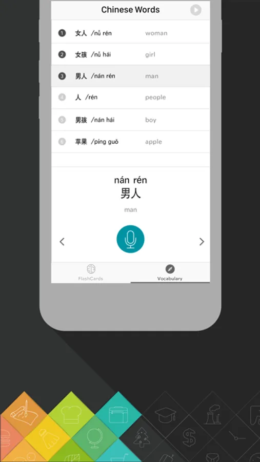 Each word in this app has Chinese characters (Both Simplified Chinese and Traditional Chinese), pinyin, audio and translation so that users are able to build up the connection of a word with its meaning and pronunciation efficiently.