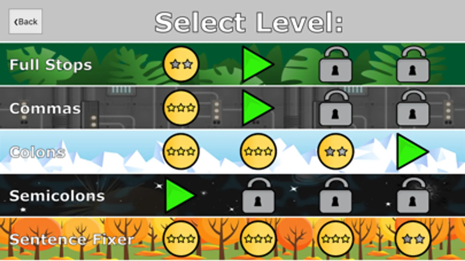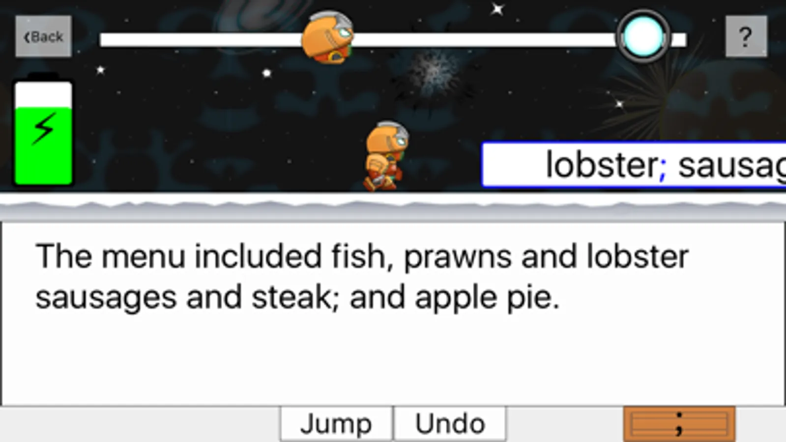 Work your way through game levels for full stops, commas, colons, semicolons and sentences. Position the missing punctuation marks and words in the right places to reach the source of energy. The faster you give a correct answer, the bigger your energy boost will be. Score a three-star energy rating on every level and achieve Sentence Hero status!