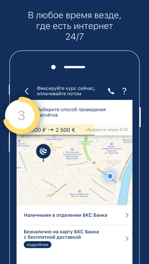 • Получить валюту наличными в отделении, которое выбираете сами, или на карту БКС Банка с доставкой по указанному Вами адресу.