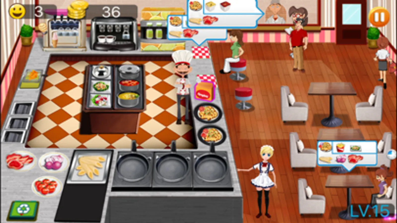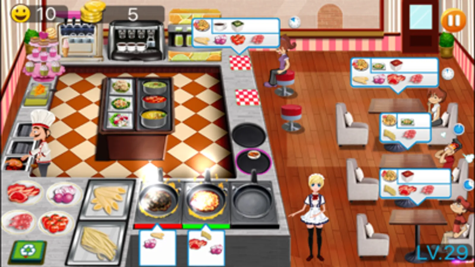If you play well, you'll accumulate profit. You can go to the shop to upgrade your facilities to provide more varieties of food, accommodate more customers and prepare customers' order more quickly.