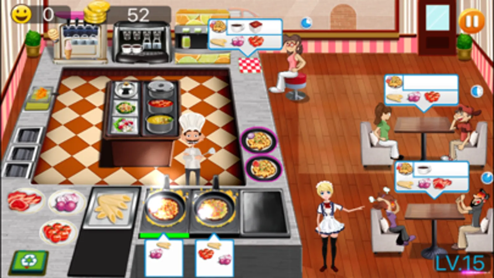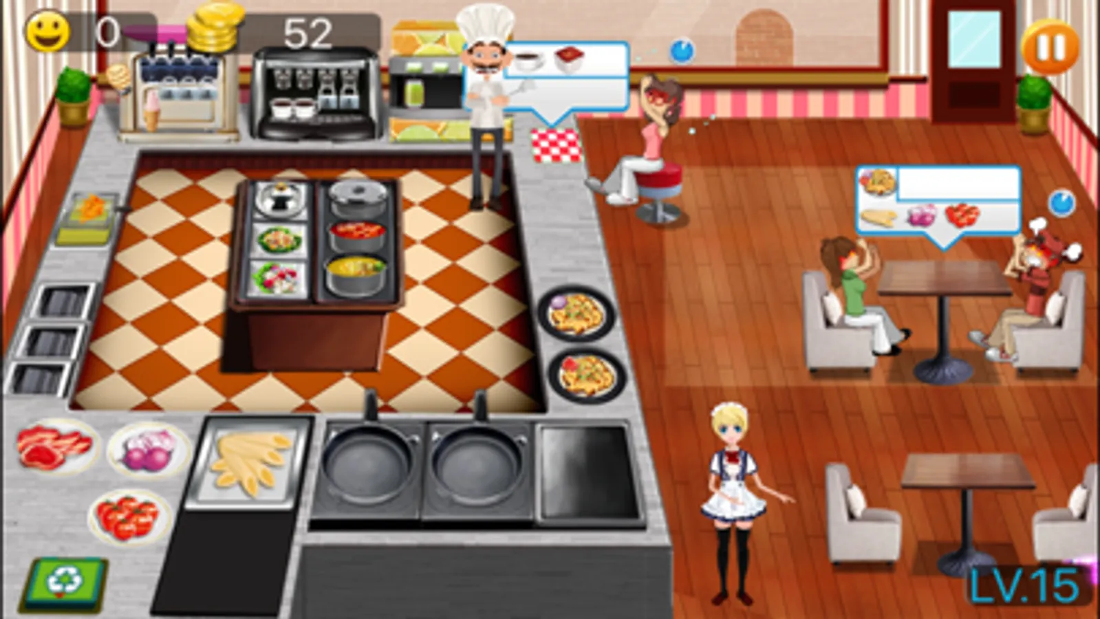 You will start up with a simple and crude spaghetti cafe with only one stove for preparing pasta, a 2-seat table and a bar seat for serving customers. You need to instruct the chef to prepare the dishes, instruct the waitress to deliver food to the customers in time, otherwise, they will be impatient and leave away. You may get extra tips if customers satisfy with your service.