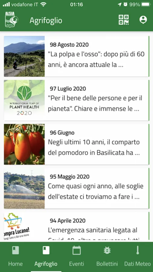 Dal nome della rivista “Agrifoglio”, giunta al decimo anno di pubblicazione, una app per restare sempre aggiornati sulle novità di settore in Basilicata, attraverso i servizi dell’Alsia, l’Agenzia Lucana di Sviluppo e di Innovazione in Agricoltura della Regione. Ogni giorno, visualizza i dati agrometeorologici di tutte le nostre stazioni di rilevamento, le news su eventi e appuntamenti regionali e nazionali di settore, gli aggiornamenti sulla biodiversità, sulla difesa fitosanitaria, sulle produzioni tipiche e di qualità, sulla multifunzionalità in agricoltura, e articoli e opuscoli redatti da tecnici specializzati dell’Agenzia.