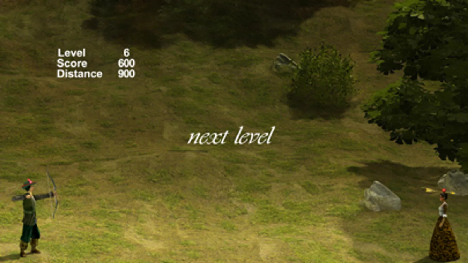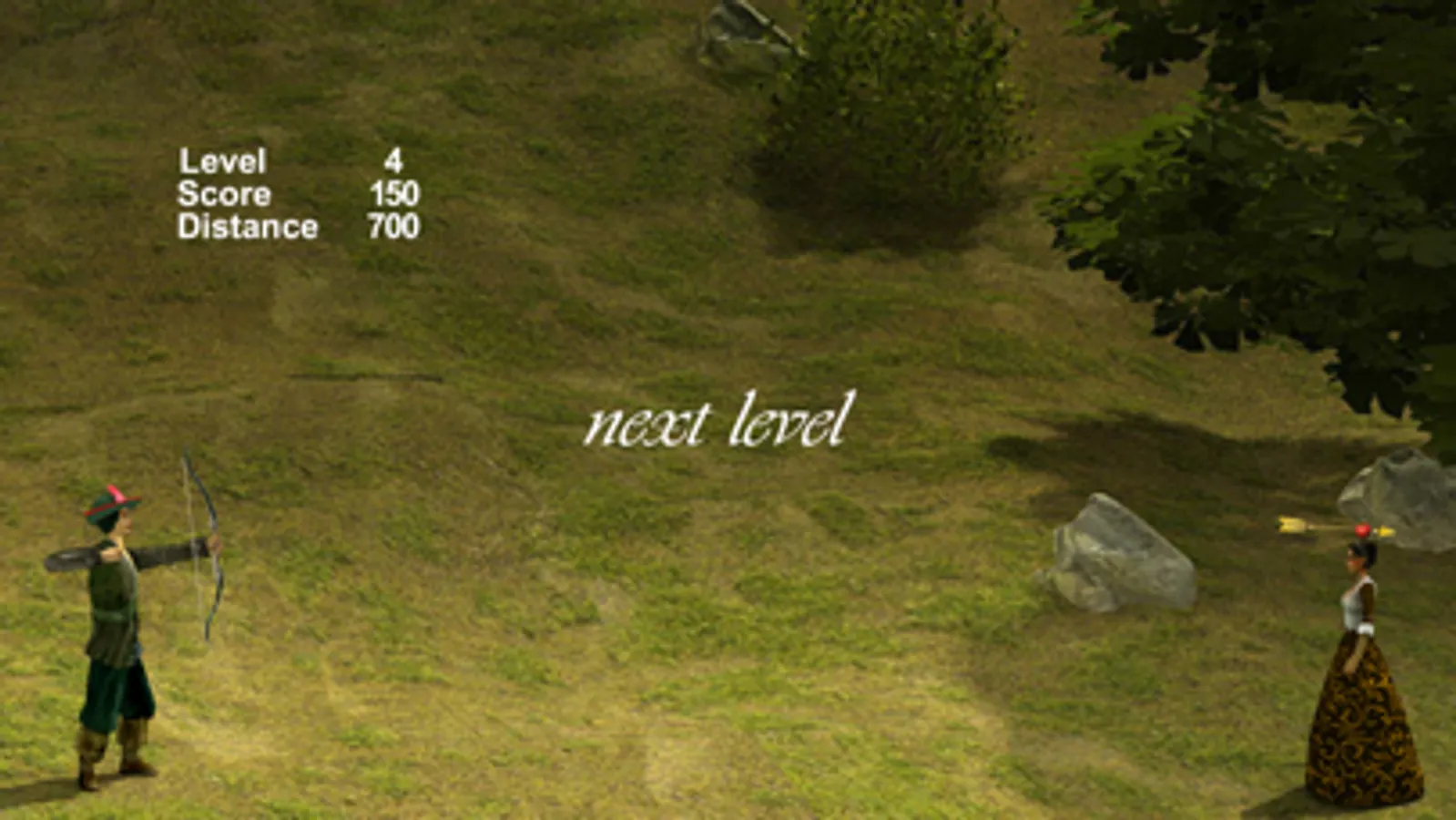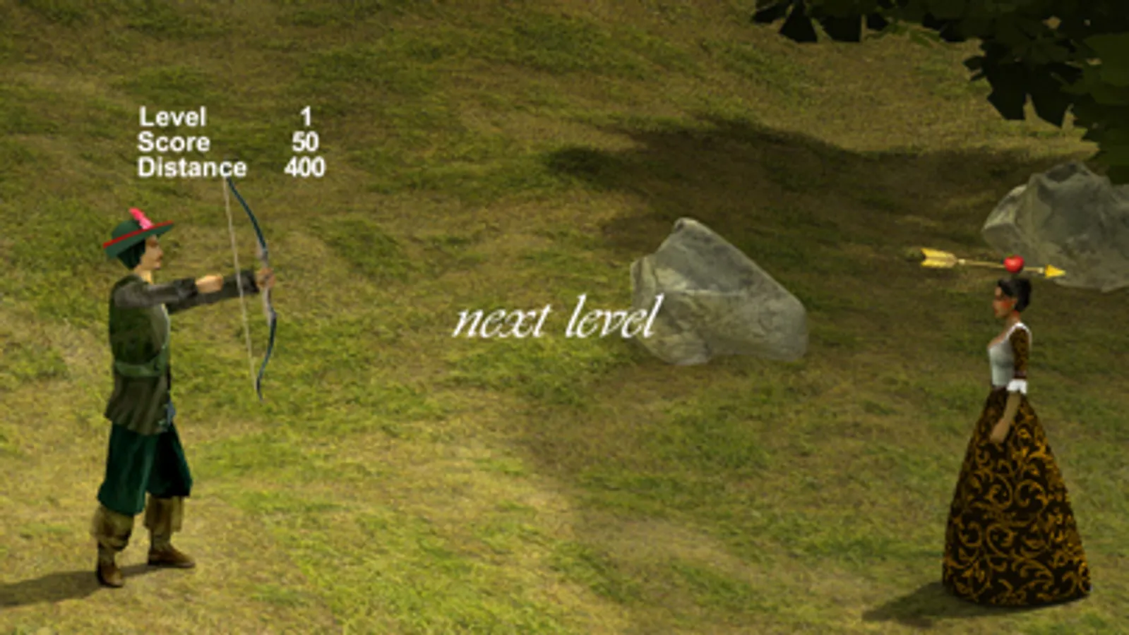 The first level of Hit The Apple places you quite close to the princess. If you hit the apple successfully without shooting the princess then you move to the next level, where you'll be placed a little further away from the target, and so on. Hit the princess and it's game over. Miss the apple and the princess and you get to try the level over.