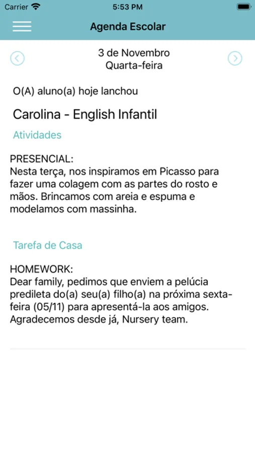 1) Checar a Agenda Escolar: visualizar as atividades e tarefas de casa que foram feitas para cada disciplina e cada dia da semana.