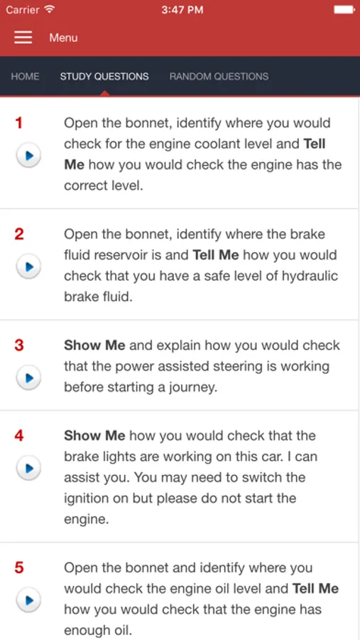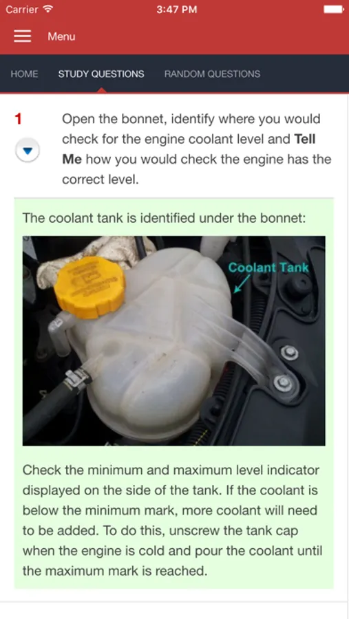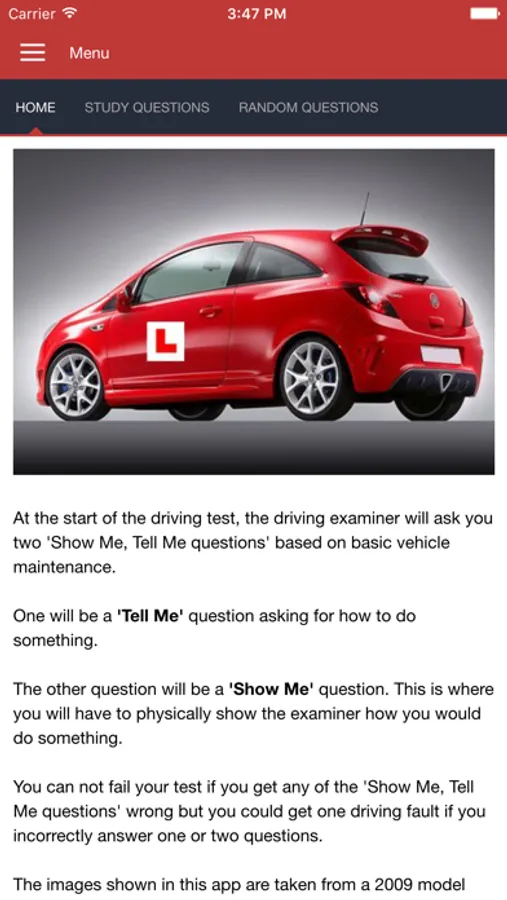 At the start of your driving test, the examiner will ask you two 'Show Me, Tell Me' questions based on basic vehicle maintenance. This app illustrates the 19 possible questions and provides answers and instructions with pictures ensuring you a great start to the exam!