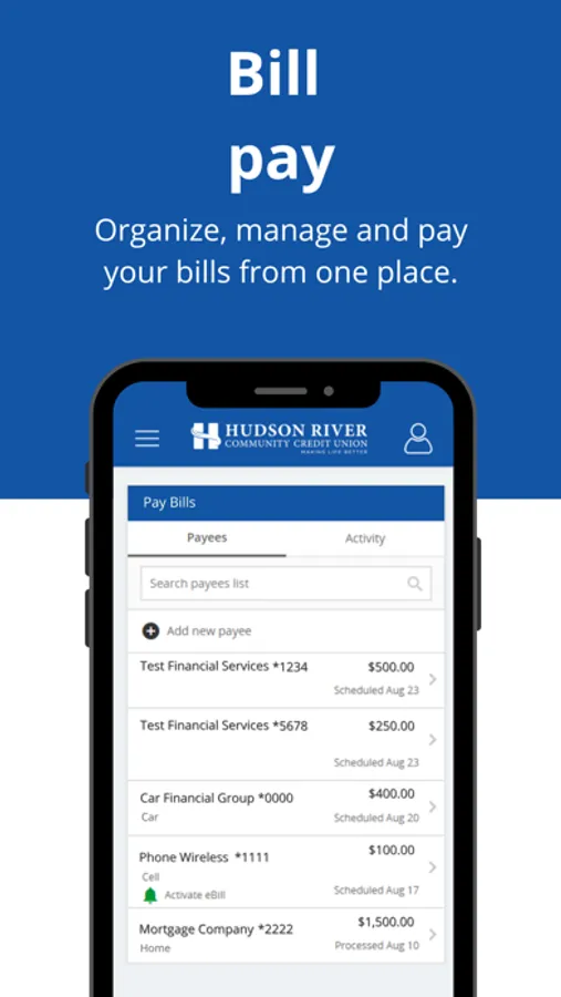 Schedule, manage, and pay bills securely as well as send money to friends and family.