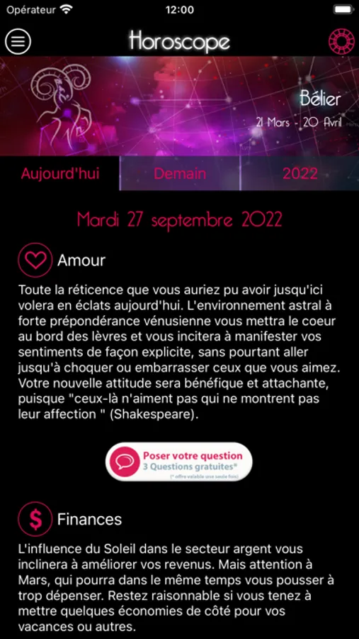 Application gratuite qui vous permets de lire votre Horoscope du jour et du lendemain sur différents thèmes: Amour, Finances, Santé, Travail, Famille, Citation, Style de vie, Conseil, Numéro chance.