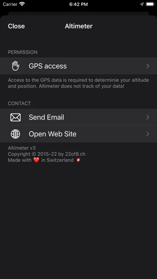 Altimeter uses GPS for determining the altitude. To save battery power it accesses the GPS chip only when displaying on your iPhone or Apple Watch. No background activity. Your position is not tracked.