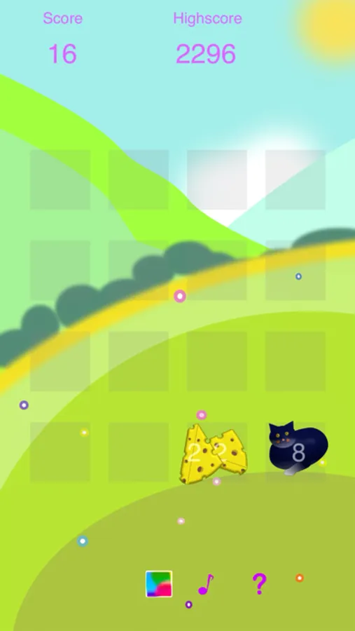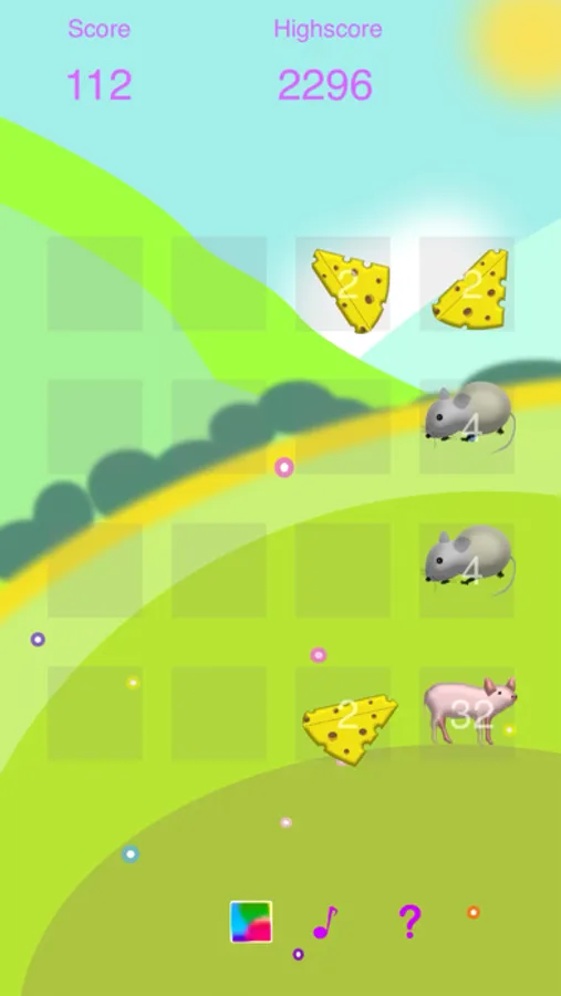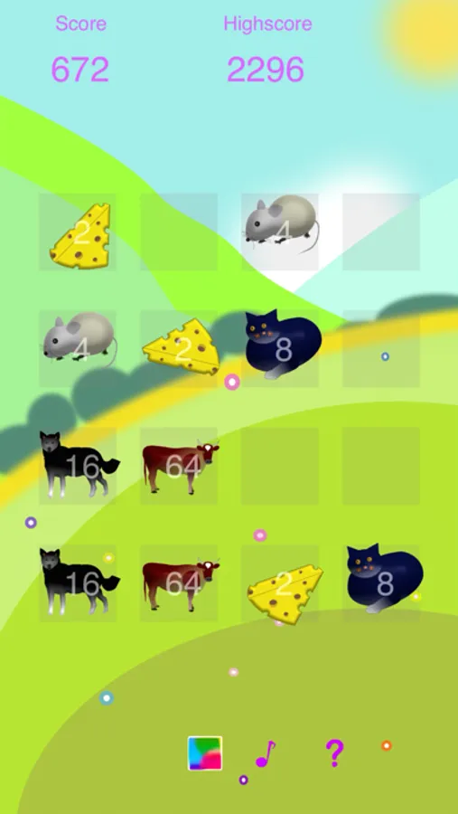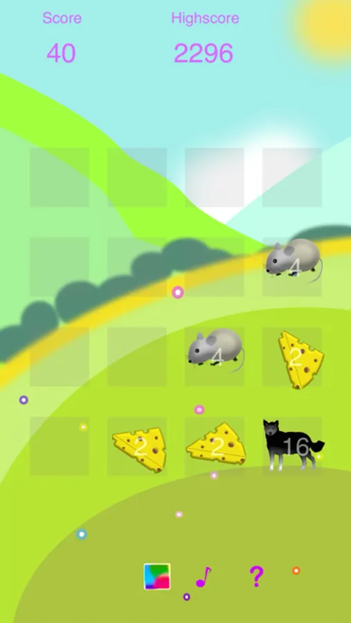 Every turn, a new tile will randomly appear in an empty spot on the board with a value of either 2 (cheese) or 4 (mouse). Tiles slide as far as possible in the chosen direction until they are stopped by either another tile or the edge of the grid. If two tiles of the same number collide while moving, they will merge into a tile with the total value of the two tiles that collided. The resulting tile cannot merge with another tile again in the same move.