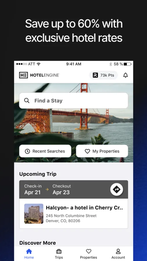 With Hotel Engine, you can experience what it feels like to travel like a professional — both on and off the clock. We built our free-to-use platform to connect businesses and business travelers with exclusive hotel savings and streamlined trip management tools, whether you're traveling for work or leisure.