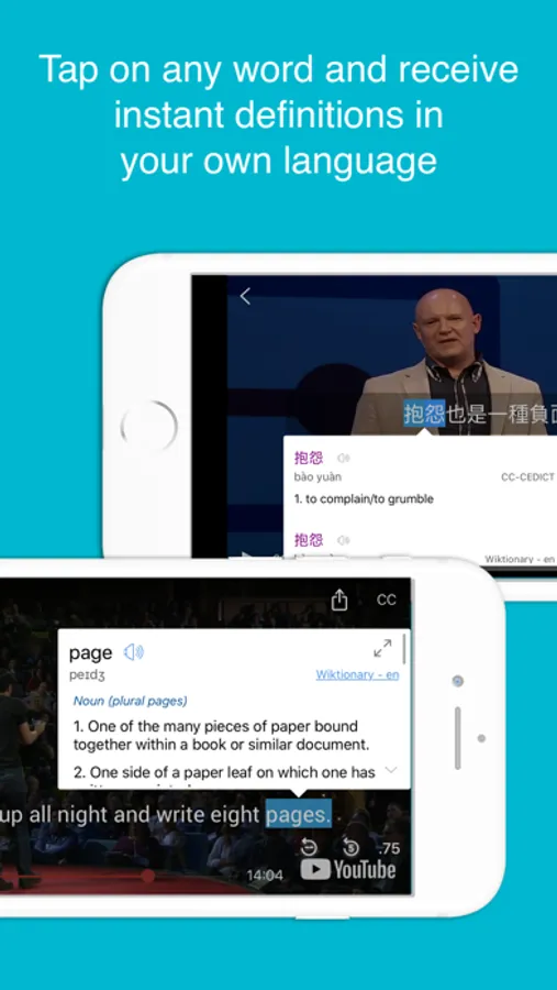 • Touch any word to see its meaning while your video pauses; Woodpecker automatically identifies proper names, popular expressions, idioms, and phrases