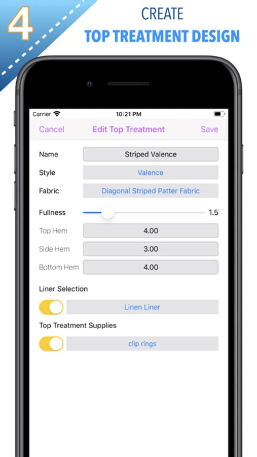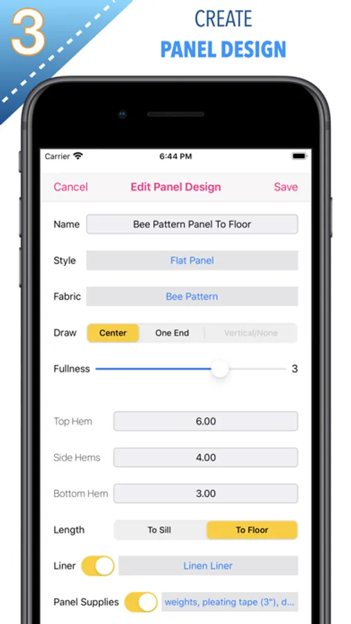 Design options include fabrics, hems, fullness, draw, length, liner, return, overlap, overhang, fabric repeat, mount type and more
