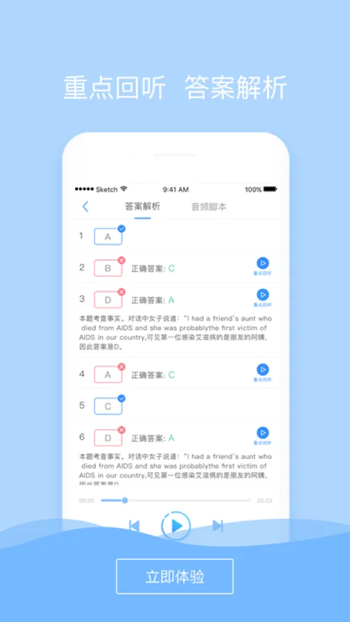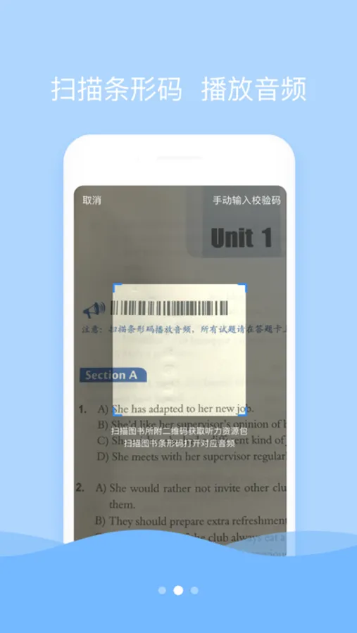 听力随身练”是上海外语教育出版社有限公司精心打造的一款外语听力练习与测试软件,也是外教社听力随身练系列图书的配套移动版应用。本应用充分利用条形码以及QR二维码技术,实现图书与音频资源和解析资源的互动:读者可通过任何二维码识别软件扫描外教社听力随身练系列图书封二所印的二维码,自动下载“听力随身练”应用;下载应用后,利用应用内的“扫码”功能再次扫描图书封二所印二维码,即可获得图书所有音频授权并下载播放图书配套音频;当用户完成听力测试之后,将答案填涂到答题卡上,然后再用应用内的“扫答题卡”功能扫描答题卡,即可获得听力测试完成情况的统计报告以及对应单元的正确答案和解析。