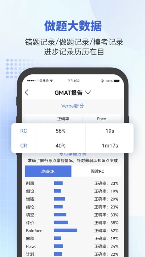 在线模拟,自动生成GMAT模考报告,方便用户查漏补缺,帮助用户全面提升