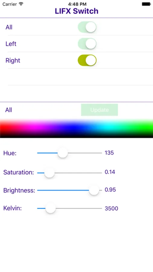 With LIFX Switch, you can turn On or Off any of your LIFX lightbulbs, set color for your lightbulbs. The App will automatically find all your LIFX devices on your local network.