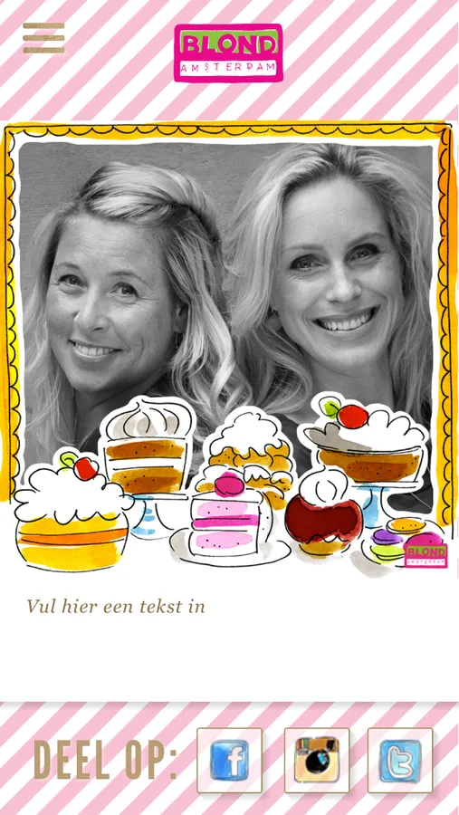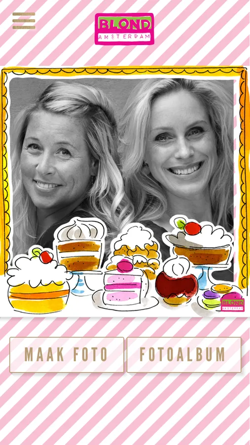 Maak een foto en plaats een passend frame over je foto heen. De frames zijn kenmerkend met de vrolijke en kleurrijke illustraties van Blond-Amsterdam.