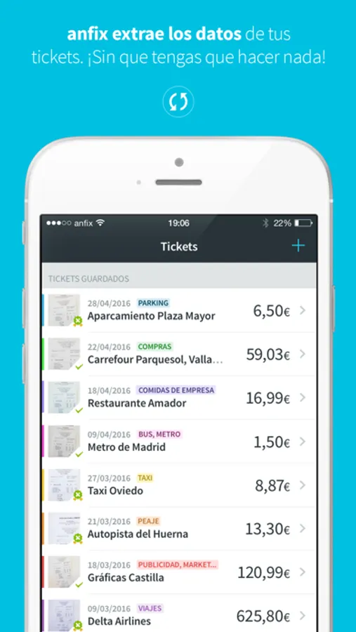 2- ¡Olvídate de perder más tickets! Digitaliza tus tickets con una simple foto y añade la información automáticamente a tu contabilidad. Todo con total validez legal, pues Anfix es la única aplicación homologada por las todas las Agencias Tributarias españolas.