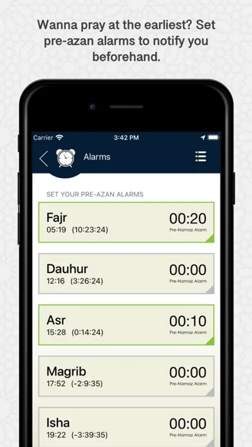 - Pre-Azan alarms: Set alarms to get notified before there is a call for prayers.