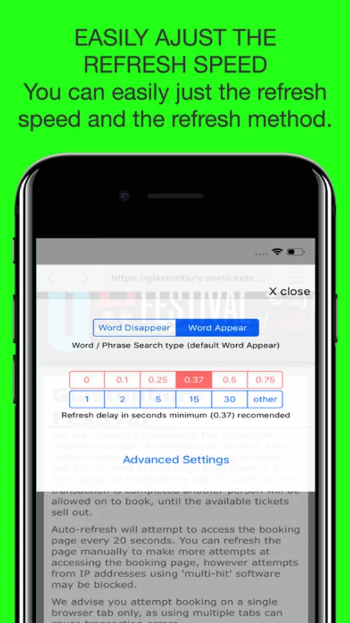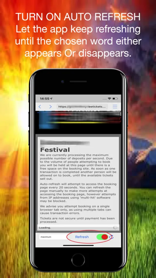 Ticketing sites can also be a real headache, with long waits in queue on a "holding page." But the Refreshinator is here to help! Set the app to refresh the holding page faster than you can, increasing your chances of getting through the queue and landing those coveted tickets. The Refreshinator has been used successfully in the Glastonbury ticket sale and resale, getting users through to the purchase area in as little as 3 seconds.