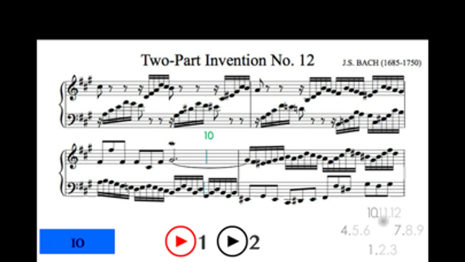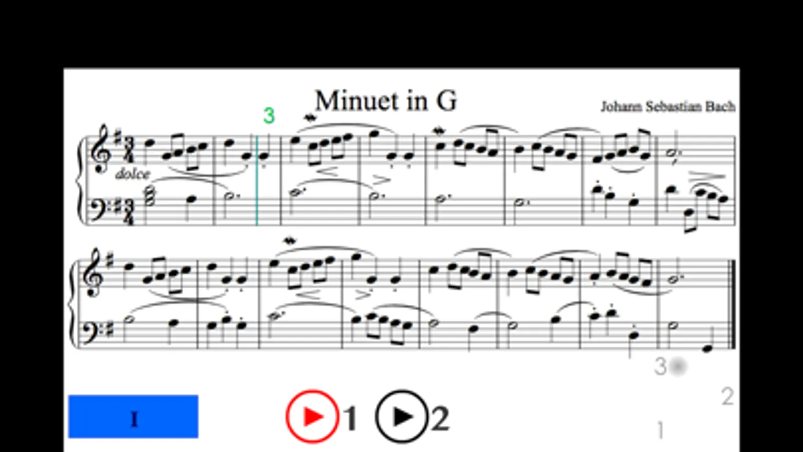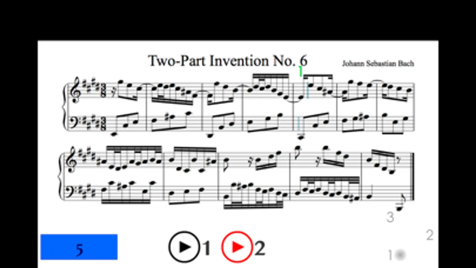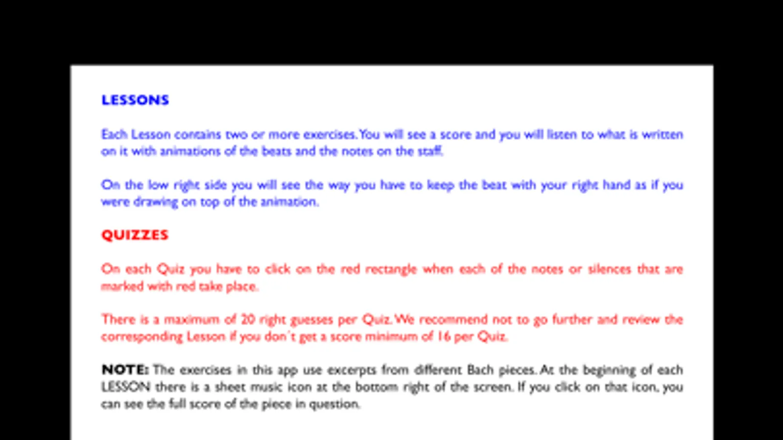 Each Lesson contains two or more exercises. You will see a score and you will listen to what is written on it with animations of the beats and the notes on the staff. On the low right side you will see the way you have to keep the beat with your right hand as if you were drawing on top of the animation.
