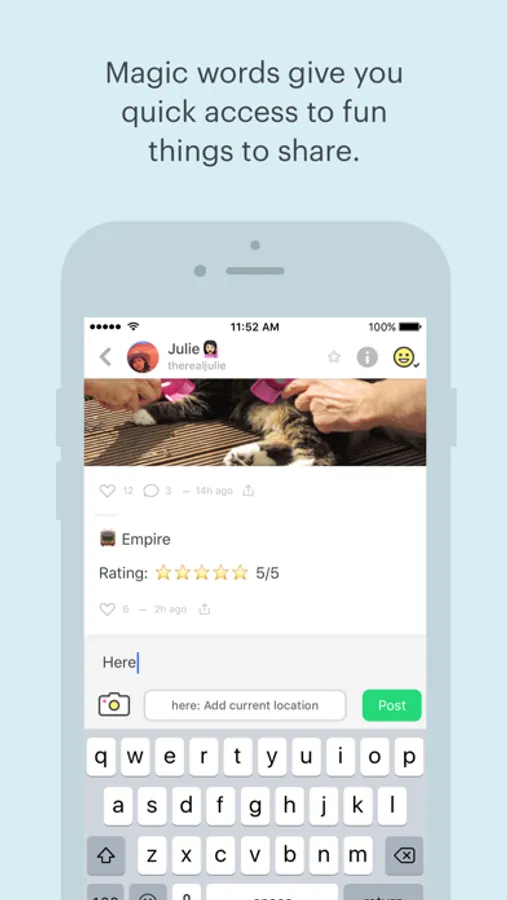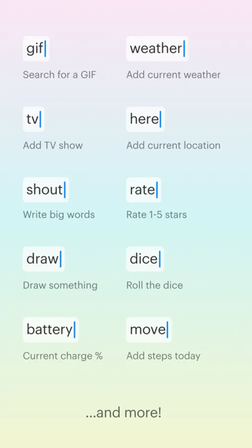 Peaching is just like texting, but better. Some words you type are magic words that give you quick access to all sorts of things to share, from drawings, links, and GIFs, to the weather, your current location, what you're watching tonight, how many steps you walked today, and much more.