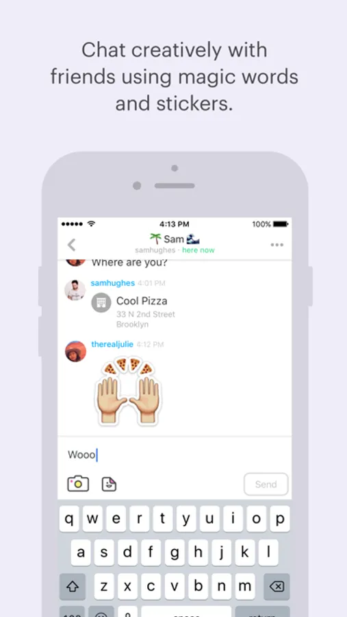 * Use the magic word “shout” to write a few words (+ emoji) in BIG letters on a background color or image. (Swipe left to add frames for an animated shout.)
