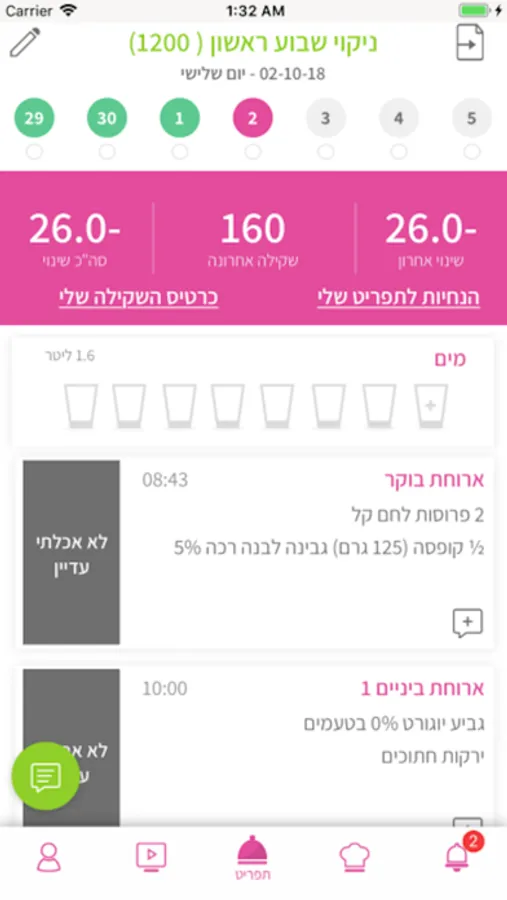 בכל שלב ביום תוכלו להיכנס לדף היומן האישי ולראות בעמוד אחד בצורה פשוטה וברורה כיצד נראה התפריט היומי