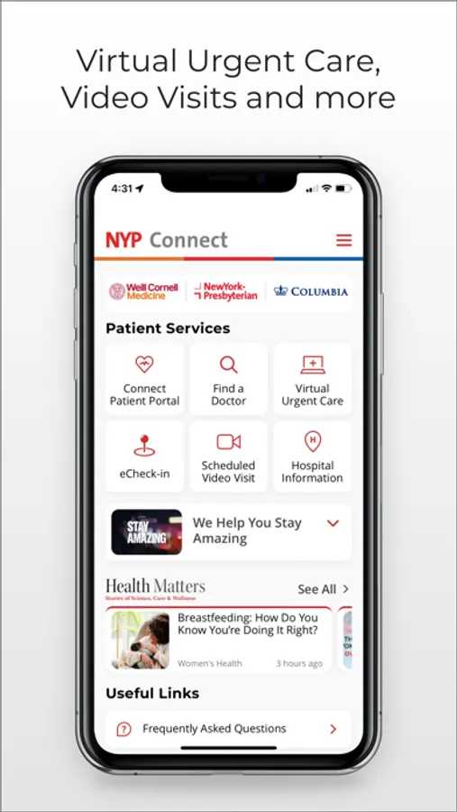 NYP Connect brings world-class care right to your fingertips, whether on-the-go, at home, or when visiting one of our locations. You can easily connect with the experts from Columbia and Weill Cornell Medicine 7 days a week for your health care needs with services such as Virtual Urgent Care, Video Visits and more, all available on your mobile or tablet device.