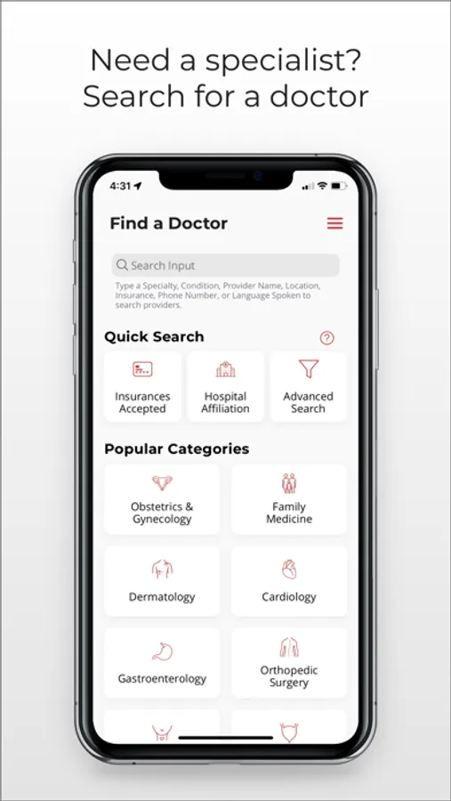 Find a Doctor: Looking for a new provider? Find care based on specialty, location, insurance, and even language.