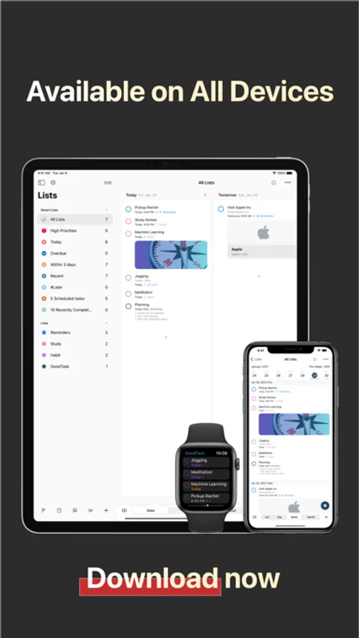 GoodTask provides various viewpoints to the things that you care and need to be done. Manage your tasks, projects and even your life better with GoodTask.