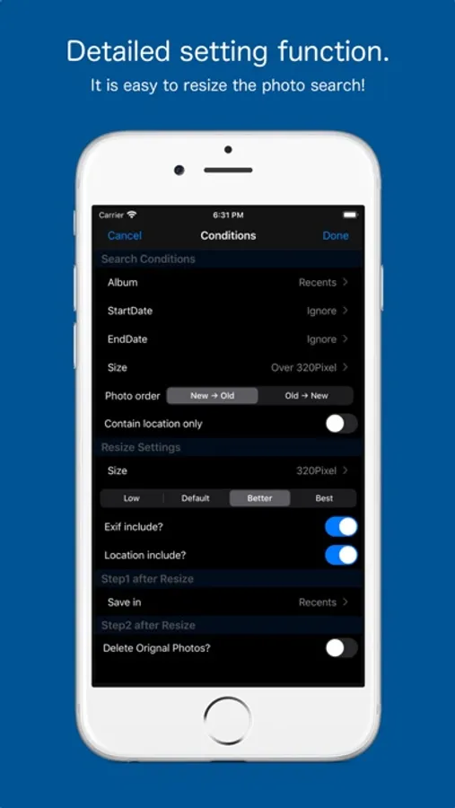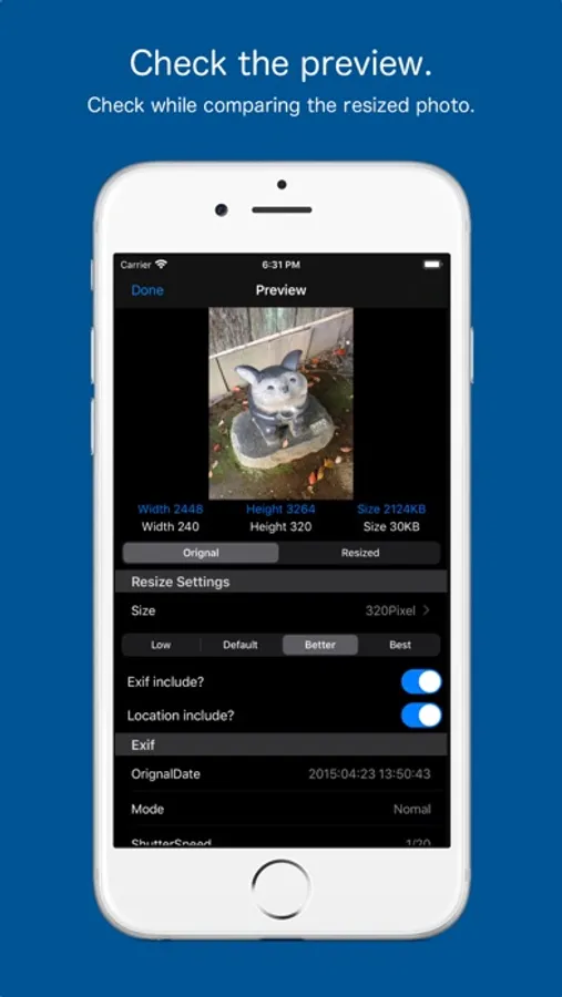 Press and hold a photo in Photo List preview screen is displayed, you can check the photo after resizing.