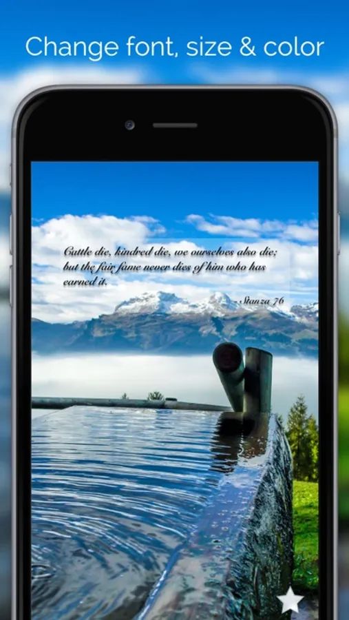 • Tons of ways to customize your experience including: changing the image; adding your own images; changing the font, font color and font size; choosing different sounds; repositioning the quote box to your liking before sharing; and changing text drop shadow and background transparency.