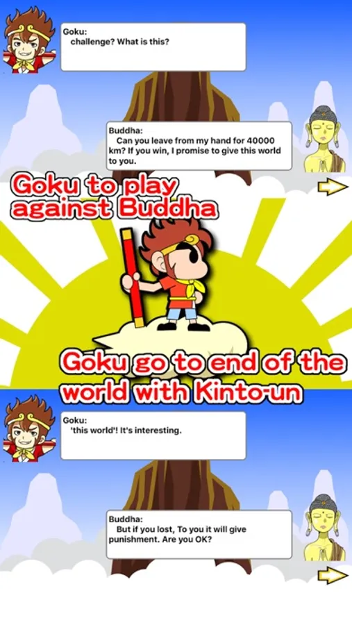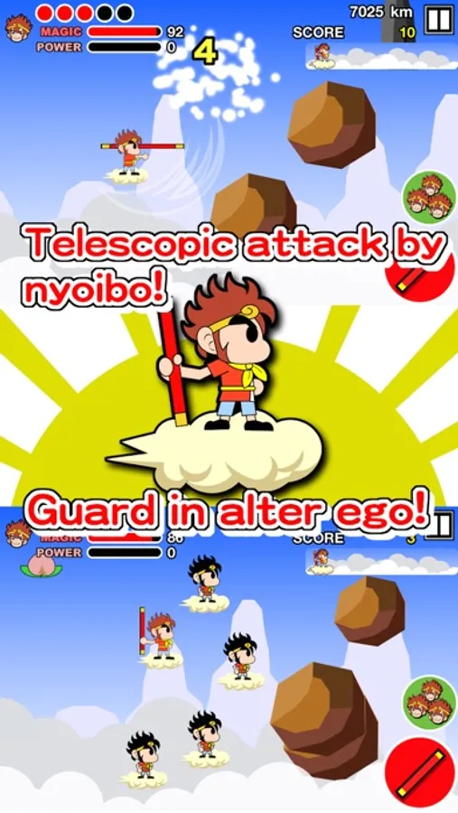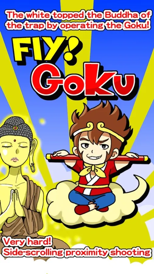 Horizontal scroll proximity shooting game to fly the Monkey King to the end of the world while destroying the obstacles with Nyoibo.