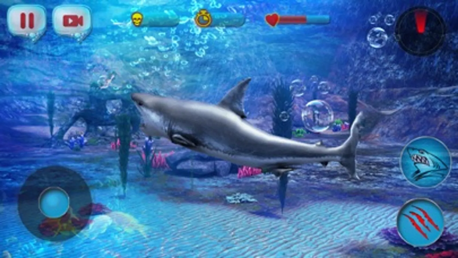 Play the Best of its type 3D Shark Sim and become a ferocious hungry SHARK to kill ruthlessly and endlessly. This mighty beast is out to eat bulk of fish and lots of human. Dive down to the depths of the ocean and fight with other Sharks and Killer Whale, eat some dolphin and lonely scuba divers to clench your hunger. Jump to the surface and attack the people enjoying on the beach, riding jet ski, rowing boats and swimming in warm waters. Beware of the shooters and they shoot on sight.
