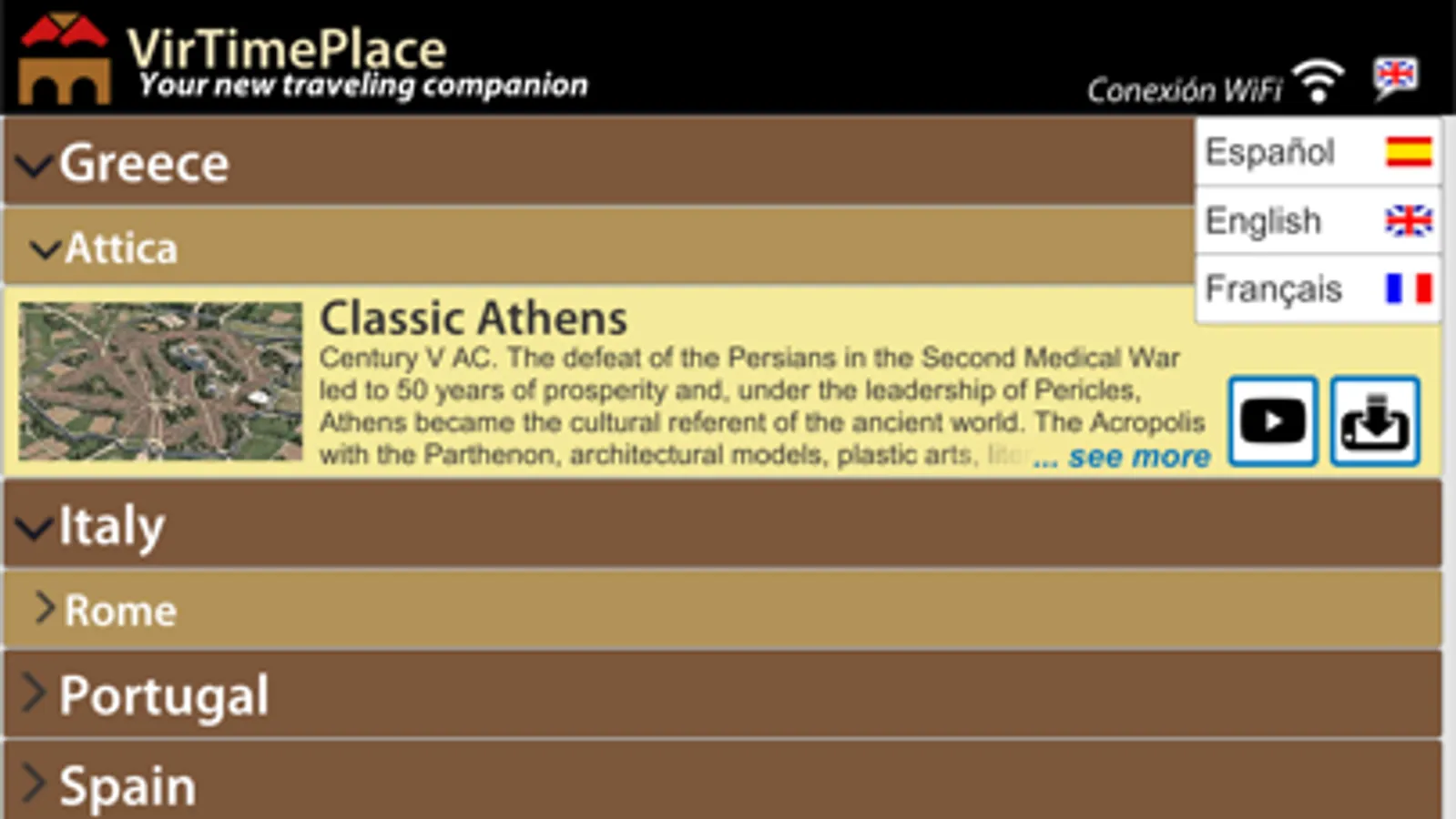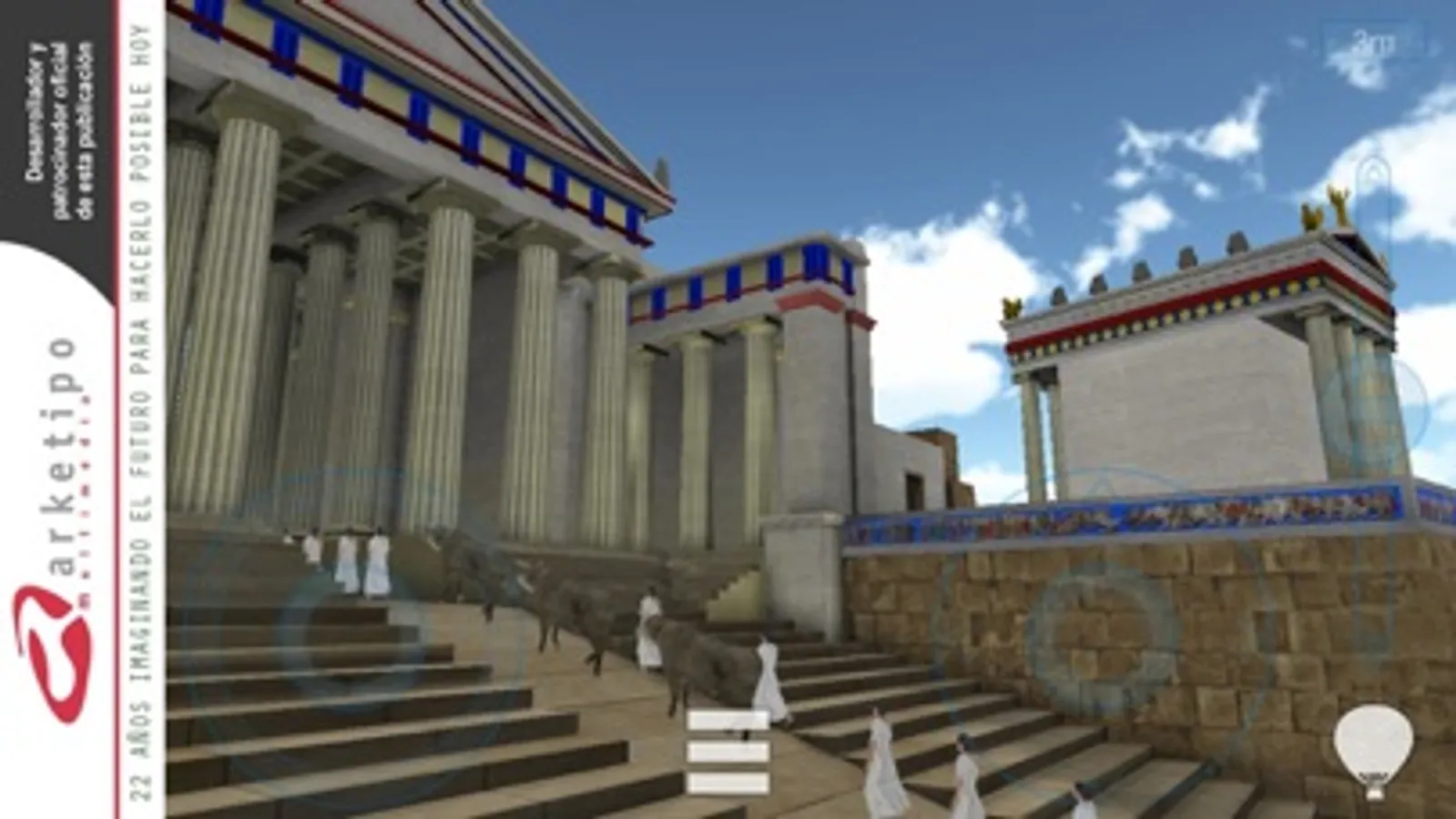 VirTimePlace is a GPS enabled Virtual Reality Player which brings you inside a 3D virtual world of historical places (complete cities or buildings) in their epoch of maximun interest, and gives you a chance to play and learn about your them.