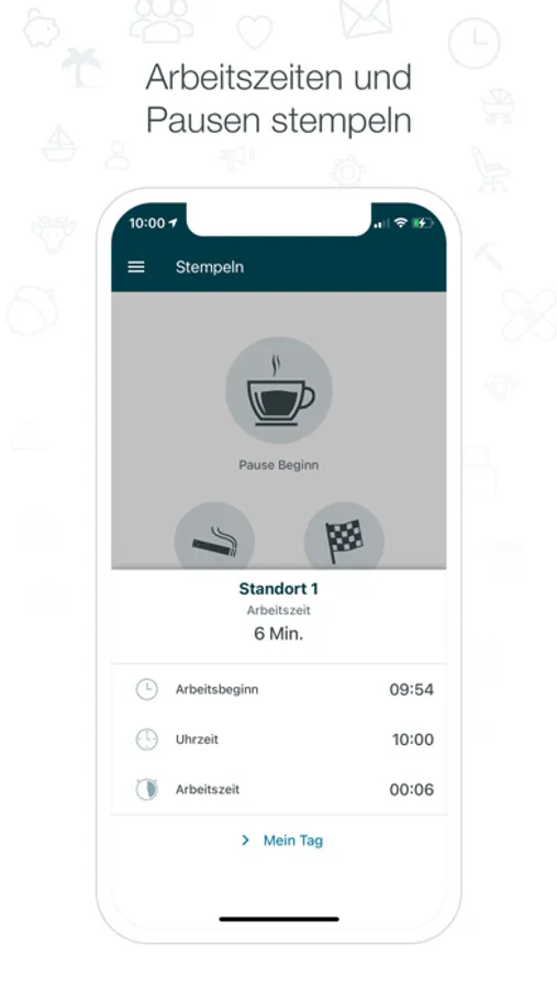 ZEIT SPAREN UND ERFASSEN: Sofort bei Arbeitsbeginn können Mitarbeiter auf ihrer individuellen App einstempeln. Auch gesetzlich geregelte Pausen sowie Raucherpausen werden einfach über das Smartphone gestempelt und sofort ins System übermittelt.