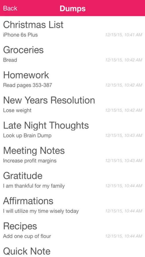 Brain Dump is a simple app that allows you to quickly dump all the things running through your mind into one place. Your brain is for thinking, not for remembering, so Brain Dump will allow you to have a level head and think clearly.