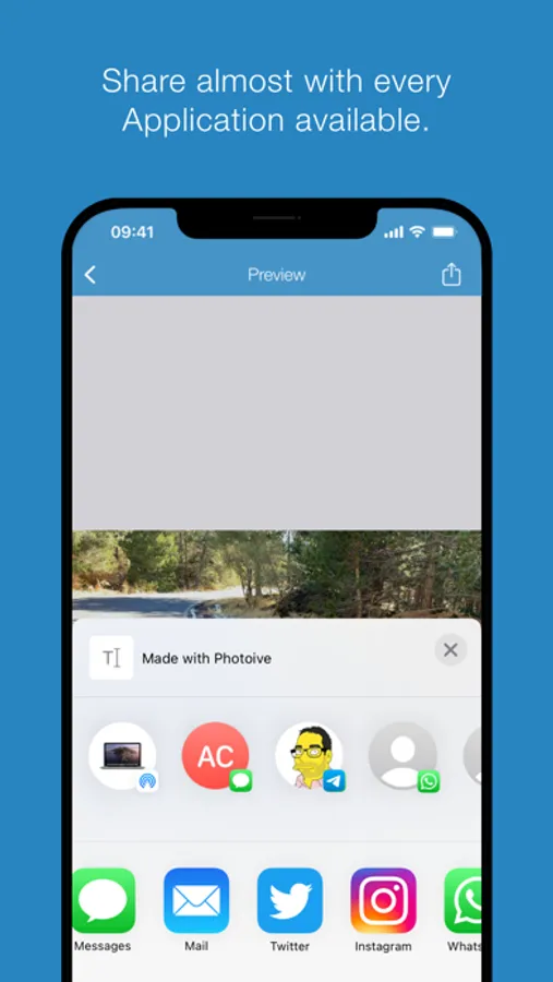 Photoive can share to many services, including: Facebook, Twitter, Instagram, Tumblr, WhatsApp, and Notes.