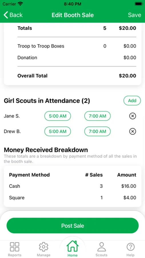 - Track which Girl Scouts attended troop booth sales along with their start and end times