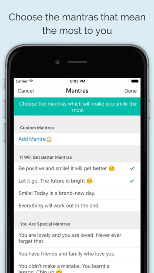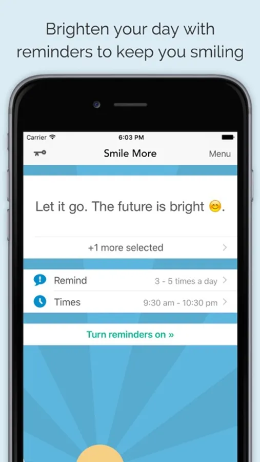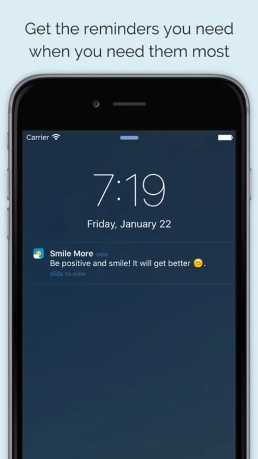 To get started just select your mantras. Smile More will then keep you positive and smiling with reminders throughout the day. Whenever you need a lift just open the app to see your chosen mantras instantly scroll through.