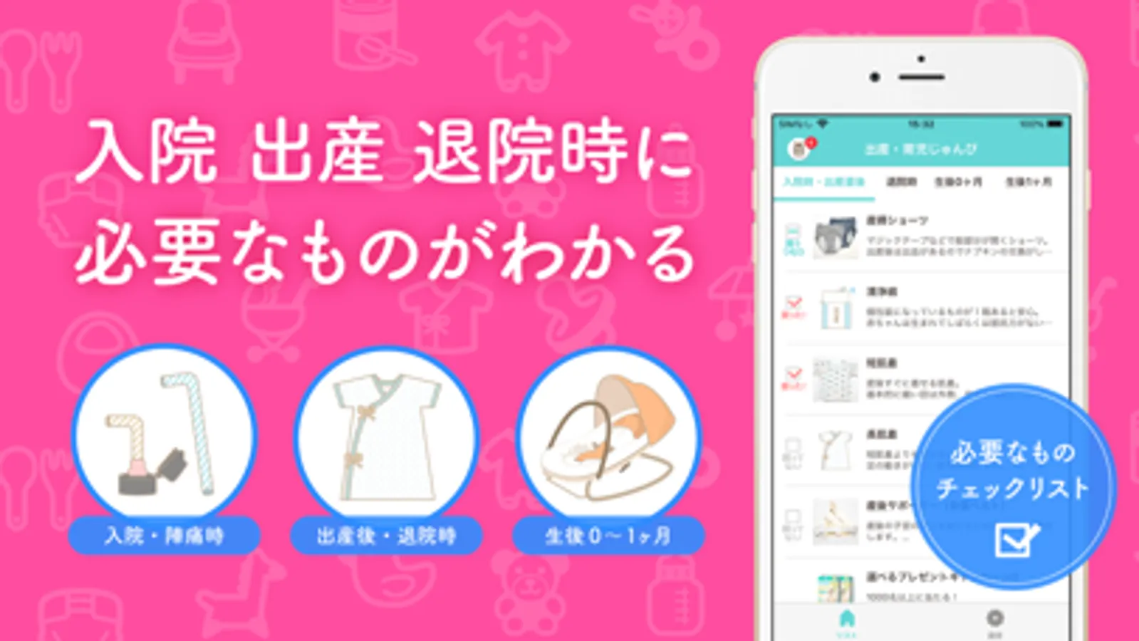 産後すぐに使うもの・あとから買えば良いものを時期別(入院準備、退院時、0か月、1か月)でチェックリスト化。