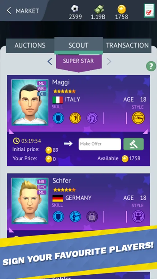 Hunt for players to meet your team’s needs. Bid against other soccer managers to win golden boys in the market, recruit all-stars with an agent, or use scouts to find young hopefuls you can make into tomorrow’s legends. Transfer players who no longer fit your strategy.
