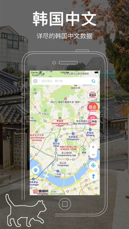 韩游地图可查询附近的酒店、美食、景点、公演、购物店等,一键使用韩国优惠券,方便又省钱。APP实时推荐周边吃喝玩乐,方便您的韩国旅行