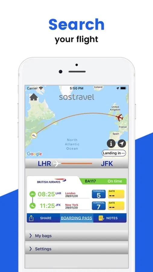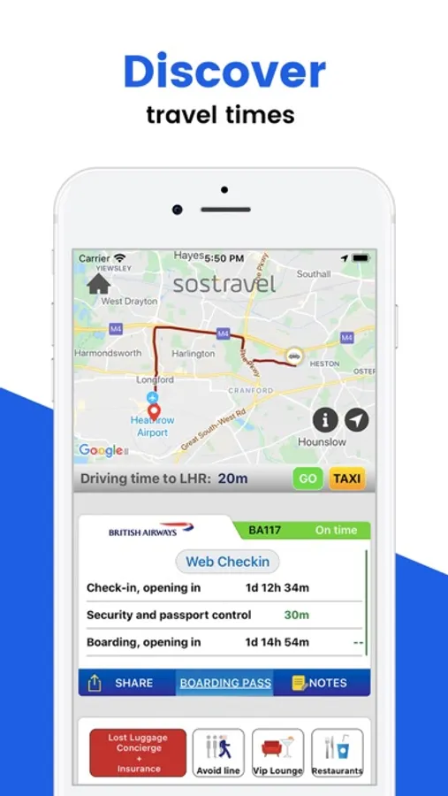 With sostravel you can manage your entire trip in one app! The only solution for all your travel needs. Enhance your trip with the many services available: info on your flight in real-time, check-in with hundreds of airlines, thousands of airports with exclusive services while you’re waiting at the airport, luggage tracking in case of delayed delivery or loss.