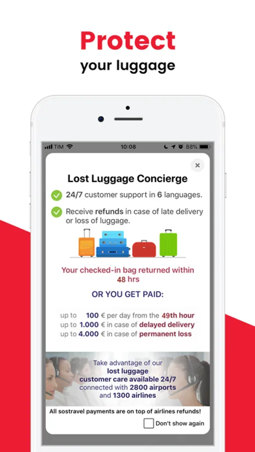 After your trip, you will receive a notification informing you of the arrival belt of your luggage. Your luggage hasn’t arrived? Contact sostravel 24/7 assistance and your luggage will be returned within 48h. Otherwise, you will receive a refund for final loss or delayed delivery.